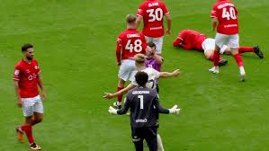 A ball down the line lifted over Feeney, who was covering for an advanced Gooch, towards McGoldrick was mildly threatening but heading towards the corner rather than directly on goal. Goodman took it upon himself to summon his inner Harald Schumacher and assault Barnsley’s veteran striker.